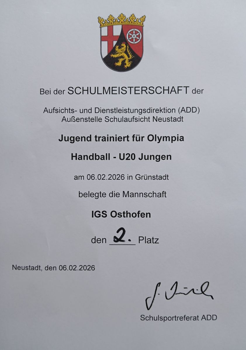 Am Freitag, den 06.02.2026, hat unsere U20-Handballmannschaft das Regionalfinale des Schulwettbewerbs "Jugend trainiert für Olympia" bestritten. In einem umkämpften Spiel konnten wir uns gegen die Mannschaft des ausrichtenden Leininger-Gymansiums aus Grünstadt mit einem Tor Unterschied durchsetzen. In der Endabrechnung mussten wir uns lediglich der Mannschaft des Sebastian-Münster-Gymnasiums aus Ingelheim geschlagen geben. Ein toller Erfolg, den unsere Handballer für unsere Schule errungen haben.